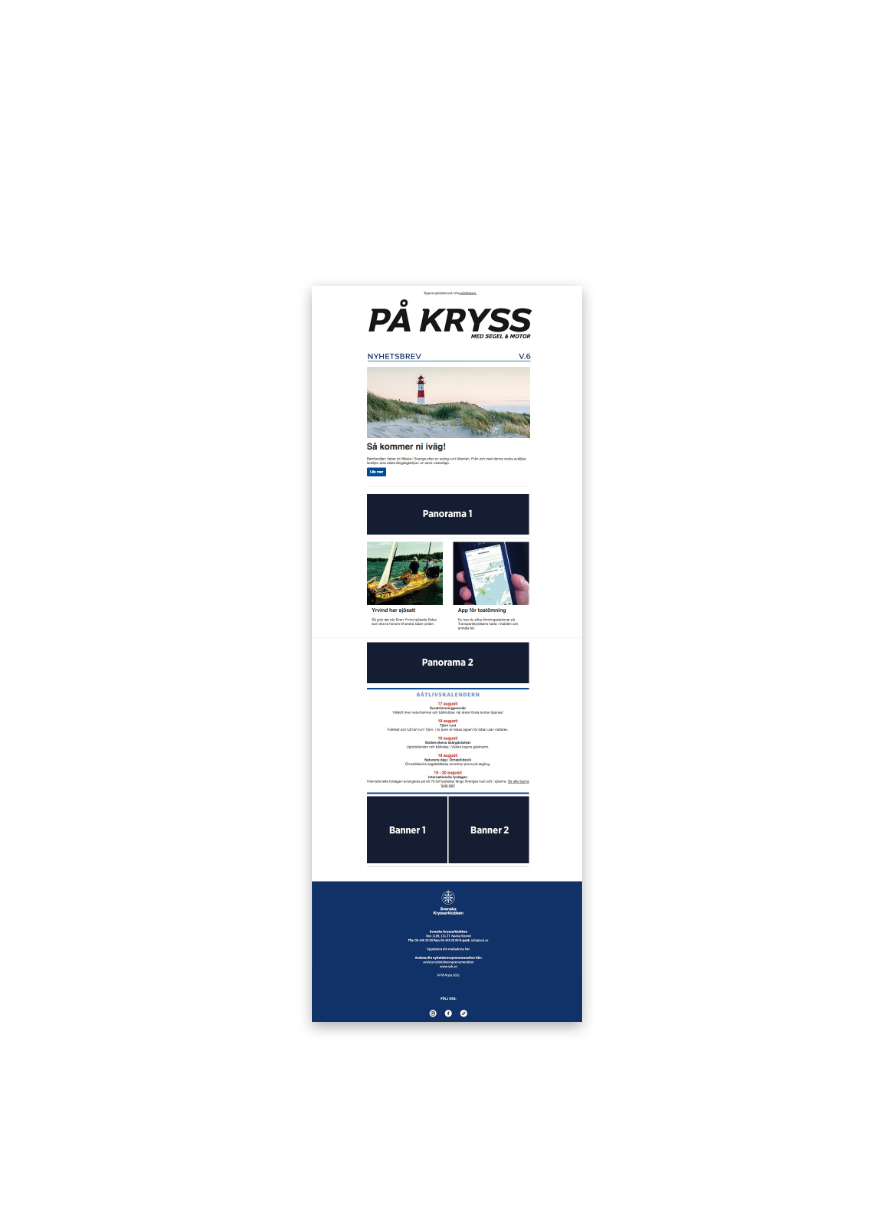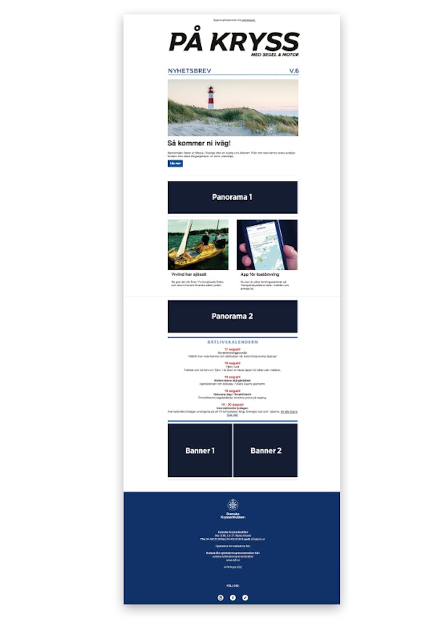 Vårt populära nyhetsbrev skickas ut varje tisdag. Det når ut till ca 20 000 adresser i Kryssarklubbens register. Nyheter från både Svenska Kryssarklubben och båtvärlden i stort. 50% öppningsfrekvens!